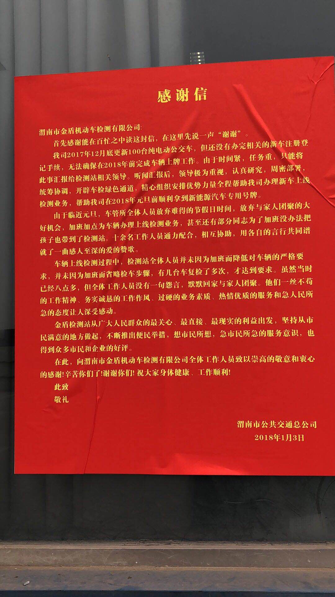 金盾機動車檢測公司收到一面錦旗和一封感謝信